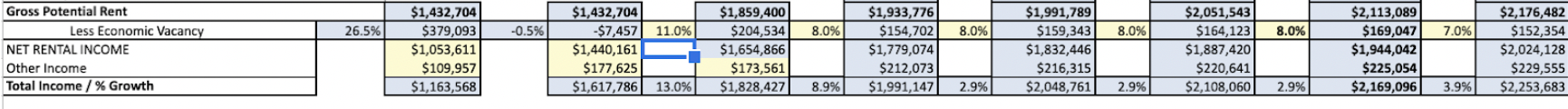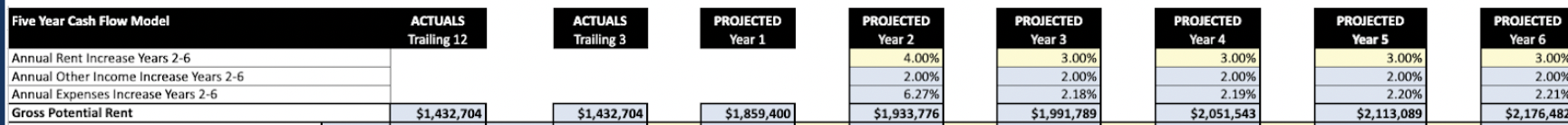 It is important to note that the rent growth we are referring to in this section is not the same as what happens when you add value to a property and increase monthly rent prices. This rent growth refers to the organic growth that occurs according to the nature of the market. Rent growth comes into play when calculating projected gross potential rent (GPR) over a 5-year period. GPR is the amount of rental income that an owner can expect to collect during a specific period of time, assuming every unit is occupied and being rented at market value. This metric is found in the 5-year analysis sheet on the 4th line and is the starting point of an underwriting analysis to understand potential rental income from a property.